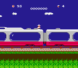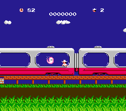 | 車両の連結部分はジャンプしないと 落っこちてしまい、ミスになる なお今回は 最低レベル設定で画面撮影したため 敵が現れてない |